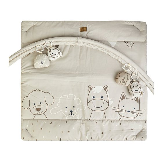 - Dizajn i materijal: Podloga je izrađena od mekog poliestera s motivima životinja s farme, a sama deka je podstavljena kako bi bebi pružila udobnost tijekom ležanja na leđima ili trbuhu.