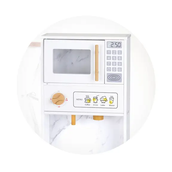 Opremljen realističnim kućanskim aparatima – sudoper, ploča za kuhanje, ploča za kuhanje, ledomat, ormarići s vratima na otvaranje, mikrovalna pećnica, set od 5 kuhinjskih posuđa i lonci.