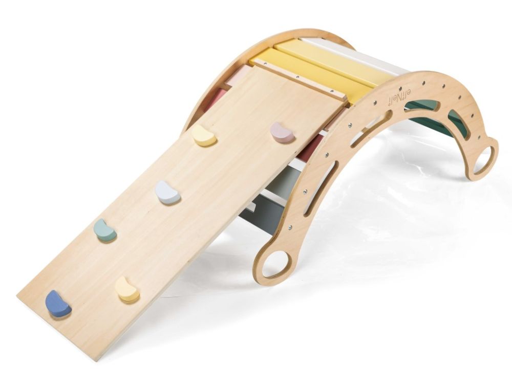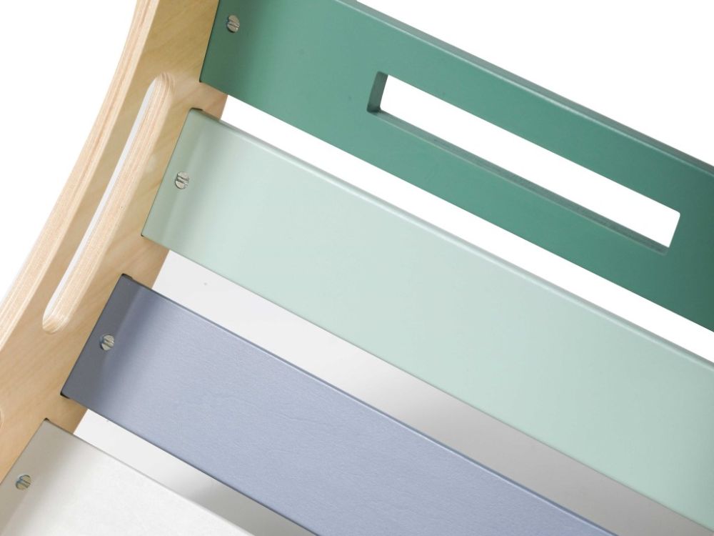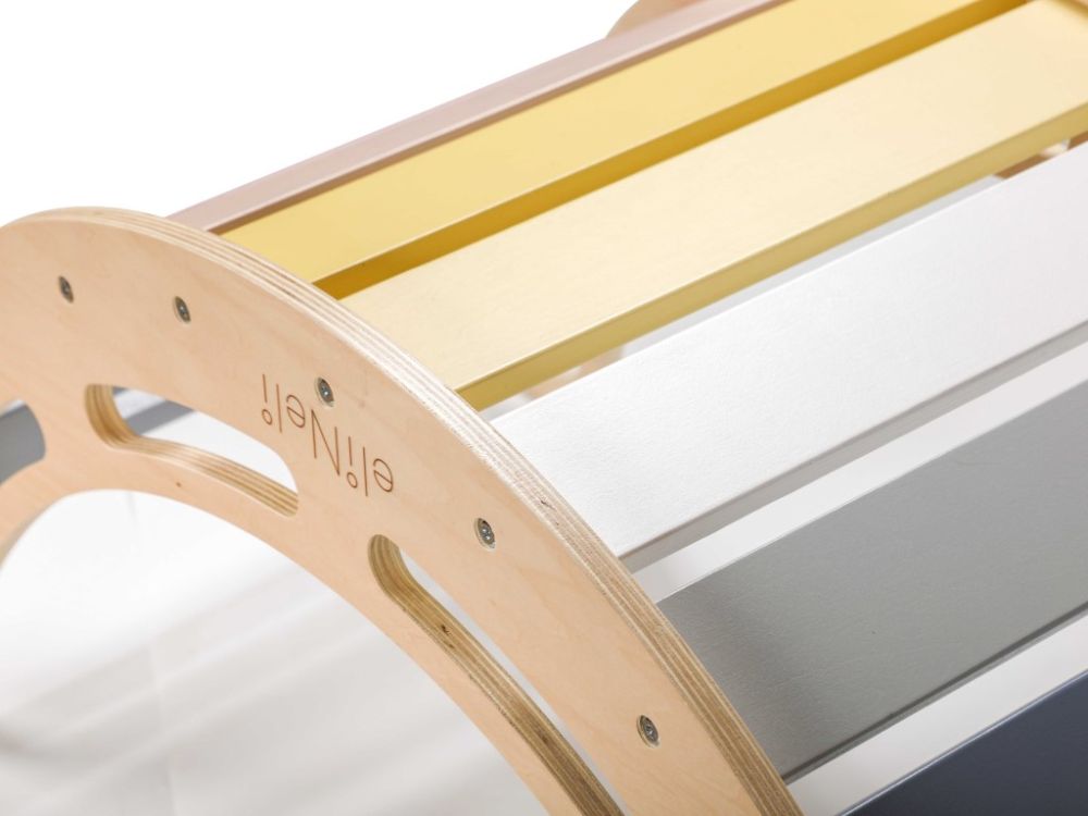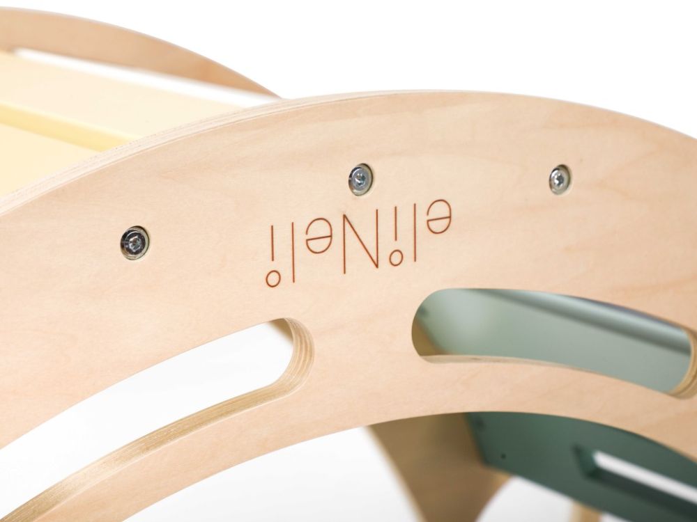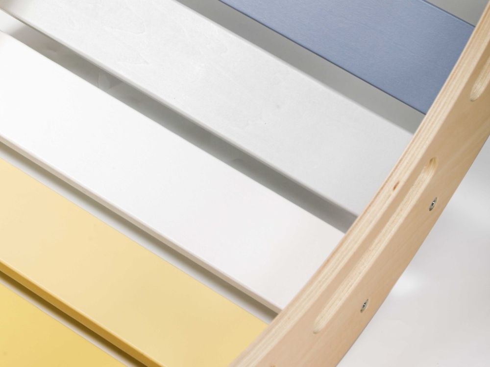 Međutim, potpuno nova dimenzija dobiva se pričvršćivanjem dvostrane ploče koja ljuljačku pretvara u igralište s toboganom ili zid za penjanje , ovisno o tome kako okrenete 2u1 ploču. Kada je vrijeme za opuštanje, samo položite ljuljačku na bok, postavite dvostranu ploču na gornju stranu (s ručkama za penjanje okrenutim prema dolje), pomaknite je i stolicu preko nje i poput magije stvorili ste set razigrano dizajniranog dječjeg namještaja u prekrasnim duginim bojama .