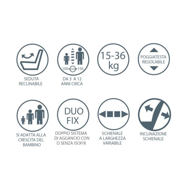 Opremljen je dvostrukim sidrišnim sustavom sa ili bez Isofix konektora (od 100 do 150 cm visine). Za djecu visine od 40 do 105 cm potrebno ga je koristiti u položaju okrenutom prema nazad, dok se u položaju okrenutom prema naprijed može koristiti za djecu od 76 cm visine i 15 mjeseci starosti.