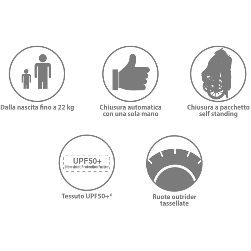 Olimpic kolica tvrtke Foppapedretti su kompaktna i vrlo udobna: prate rast bebe jer se mogu koristiti od rođenja do 22 kg. Dodatnu udobnost pružaju “outrider” kvrgave gume s ovjesom, pogodne za sve vrste terena, te UPF50+ tkanina s vodootpornim patentnim zatvaračima. Lako se sklapa mehanizmom jednom rukom i kada se sklopi ostaje stajati.
