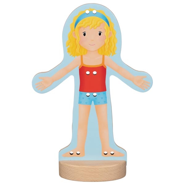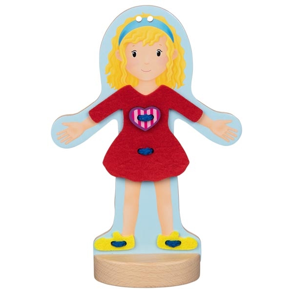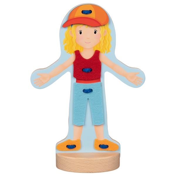 Odijevanje i presvlačenje u svom najljepšem obliku. Svi odjevni predmeti izrađeni su od filca, za pričvršćivanje se koriste pamučne vrpce u 3 boje, a sama živahna figura izrađena je od drveta. Savršeno za dječje ruke.