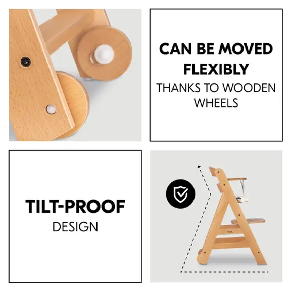 I sigurnosni remen i pojas u 5 točaka pomažu u zaštiti vašeg djeteta i kompatibilni su s drugim hauck dodacima. Na prostranom drvenom pladnju Vaše dijete ima puno prostora za jelo i igru. Alternativno, možete promijeniti pladanj sa sigurnosnom šipkom i gurnuti stolicu izravno ispod obiteljskog stola. Mekano sjedalo i naslon za leđa nude vašem djetetu udoban položaj za sjedenje u svakom trenutku.