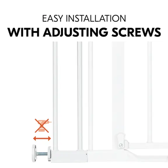 Instalacija je vrlo jednostavna: spojite nastavak na sigurnosna vrata pomoću priloženih konektora. Zatim pričvrstite vijke za podešavanje na vanjske strane nastavka. Na kraju, pričvrstite vrata i nastavak tako da ih čvrsto pritisnete u okvir vrata ili stubište – brzo, stabilno i sigurno.