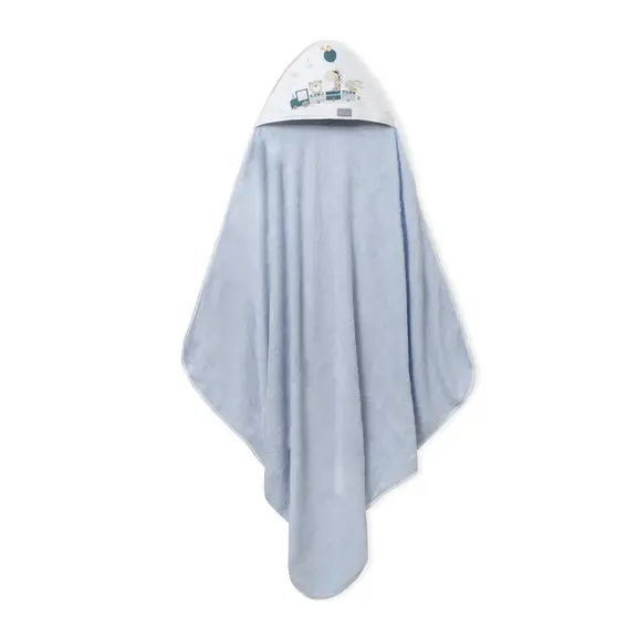 Plavi ručnik za kupanje s kapuljačom, izrađen od 100% pamuka 400gr/m. To jamči mekoću potrebnu za sušenje nježne bebine kože. Njegova veličina od 100 x 100 cm omogućuje vam da ih lako zamotate kada izađete iz kupaonice i držite ih toplima.