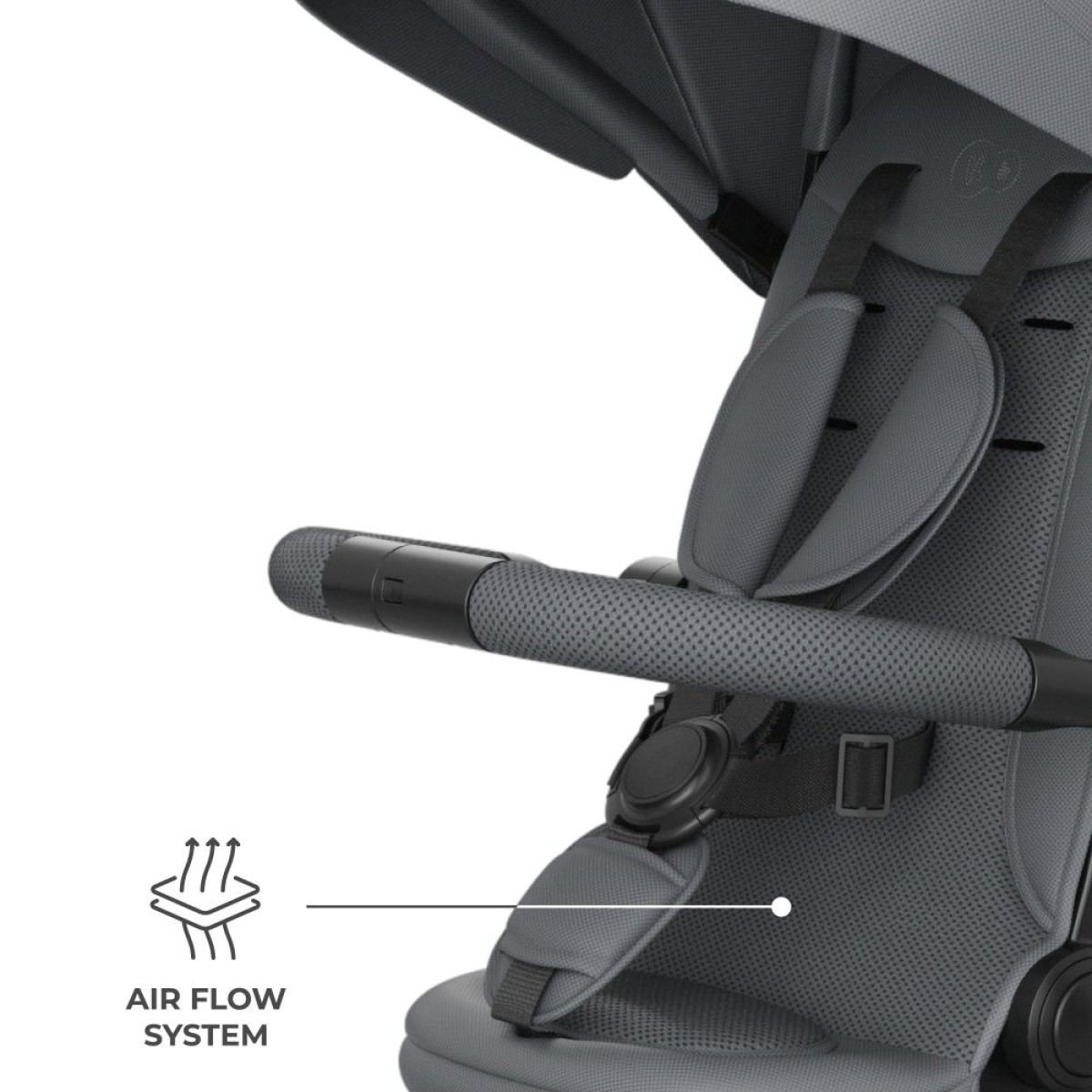 Na duljim rutama velika je pomoć poluležeći položaj dostupan u oba smjera vožnje. Kad dijete od umora sklopi oči, roditelj brzo spusti naslon i nastavlja šetnju bez prekidanja dnevnog ritma. Udobnost upotpunjuju ventilirani umetci AIR FLOW te podesiv krović s prozorčićem – lako se prilagođava vremenu i omogućuje da bacite pogled na dijete tijekom vožnje.
