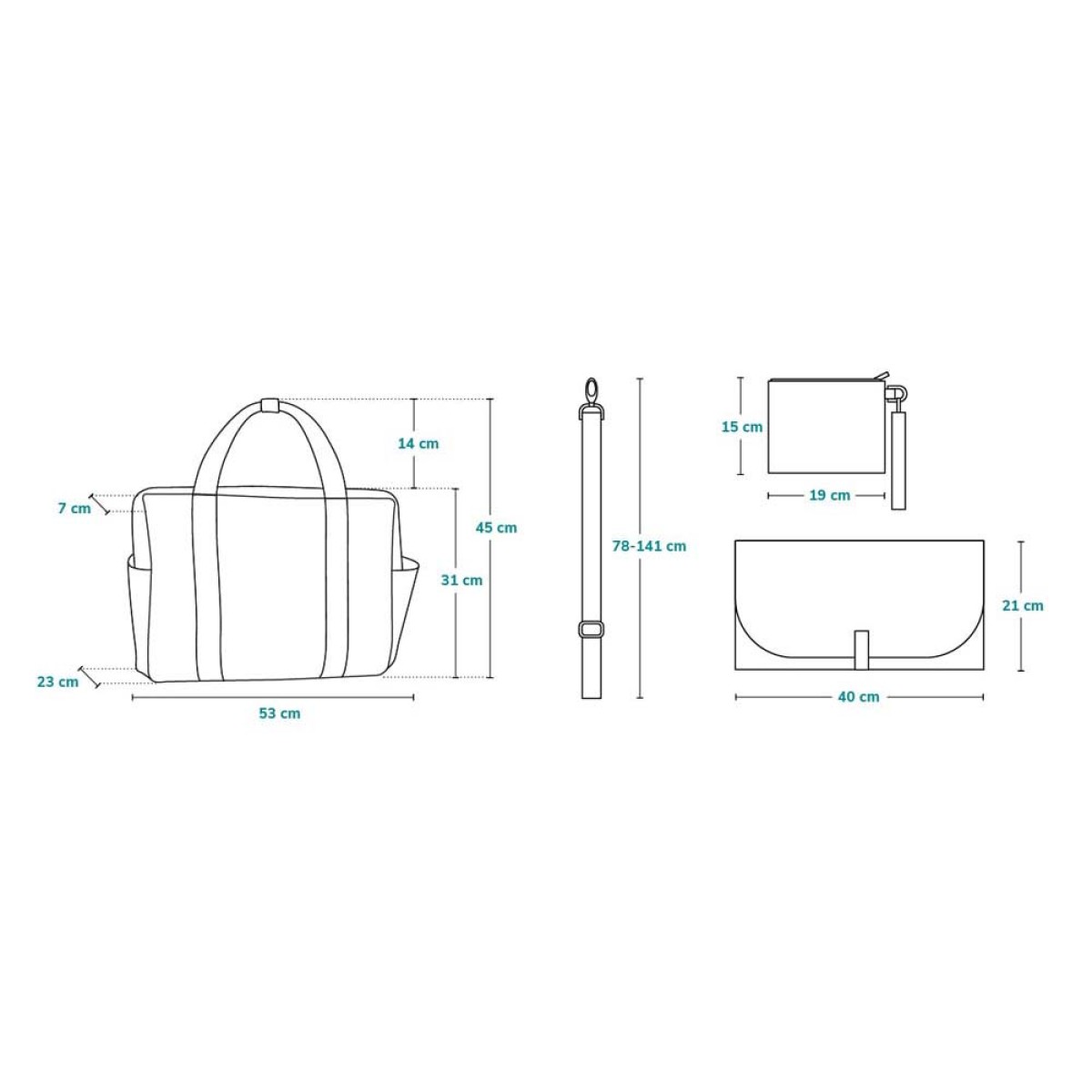 U kompletu dolazi kompaktna podloga za presvlačenje, toaletna torbica na patentni zatvarač, kao i remen za nošenje na ramenu.