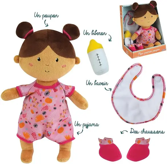Ova prva mekana i platnena lutka savršeno je prilagođena malim ručicama vašeg djeteta. Raznovrsni dodaci potiču ga da se brine o njemu: oblači ga i daje mu bočicu, u ritmu svoje mašte i priča koje sam izmišlja.