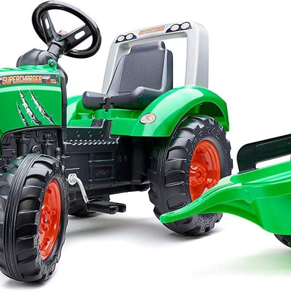 Traktor s pedalama Falk Supercharger opremljen volanom, sirenom i prikolicom – za male vrtne avanturiste od 2 do 5 godina. Poklopac (hauba) koji se otvara omogućuje mladim mehaničarima pristup motoru za provjeru remena, filtera i svjećica. Prikolica se lako zakači na traktor za utovar i transport pijeska, lišća, zemlje i kamenja s jednog kraja vrta na drugi. Vaši mladi vrtlari ili farmeri će razviti svoju neovisnost i maštu. Jednostavan za rukovanje zahvaljujući upravljaču sa sirenom, traktor je 100% proizveden u Francuskoj i jamči sate zabave na otvorenom!