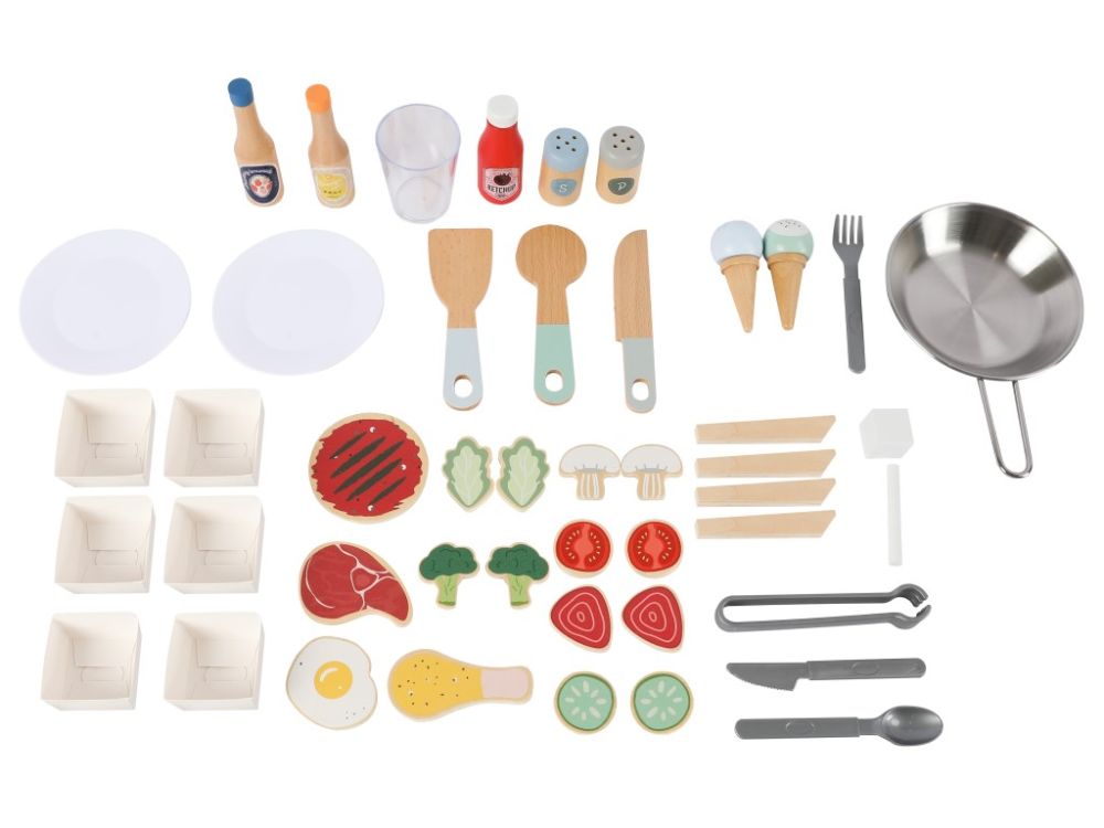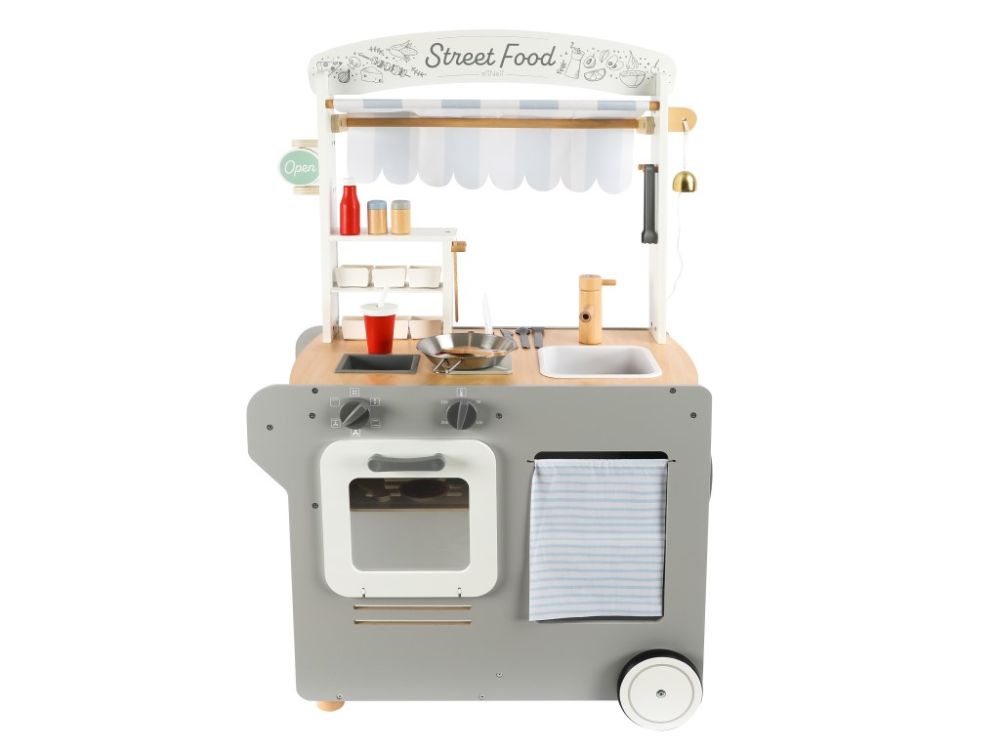 Dječja drvena trgovina pretvara svako dijete u kuhara i trgovca. U mobilnoj trgovini grickalica , djeca mogu kuhati, peći i pržiti razne poslastice, prodavati pića sa ledom i sladoledom. Za udobnost gostiju, trgovina uključuje mali stol u obliku pulta i stolac kako ne bi morali jesti stojeći. Ova edukativna igračka omogućit će djeci da isprobaju zanimanje kuhara i prodavača, kuhajući, pržeći i pekući na način siguran za djecu. Trgovina uključuje osnovne uređaje – pećnicu, štednjak, tavu, aparat za led, sudoper, prostor za pohranu, police, tendu, ploču za dnevni jelovnik, zvono i ostale gadgete. Dječja trgovina opskrbljena je posuđem, kuhinjskim priborom , začinima i namirnicama. Kotači čine trgovinu mobilnom , djeca je mogu otvoriti bilo gdje u kući ili stanu, lako se pomiče i lako se rukuje . Igrajući se u dječjoj kuhinji, djeca usavršavaju svoje motoričke sposobnosti, koordinaciju oko-ruka , ručnu spretnost , razvijaju maštu i kreativnost, igraju uloge i grade društvene veze.